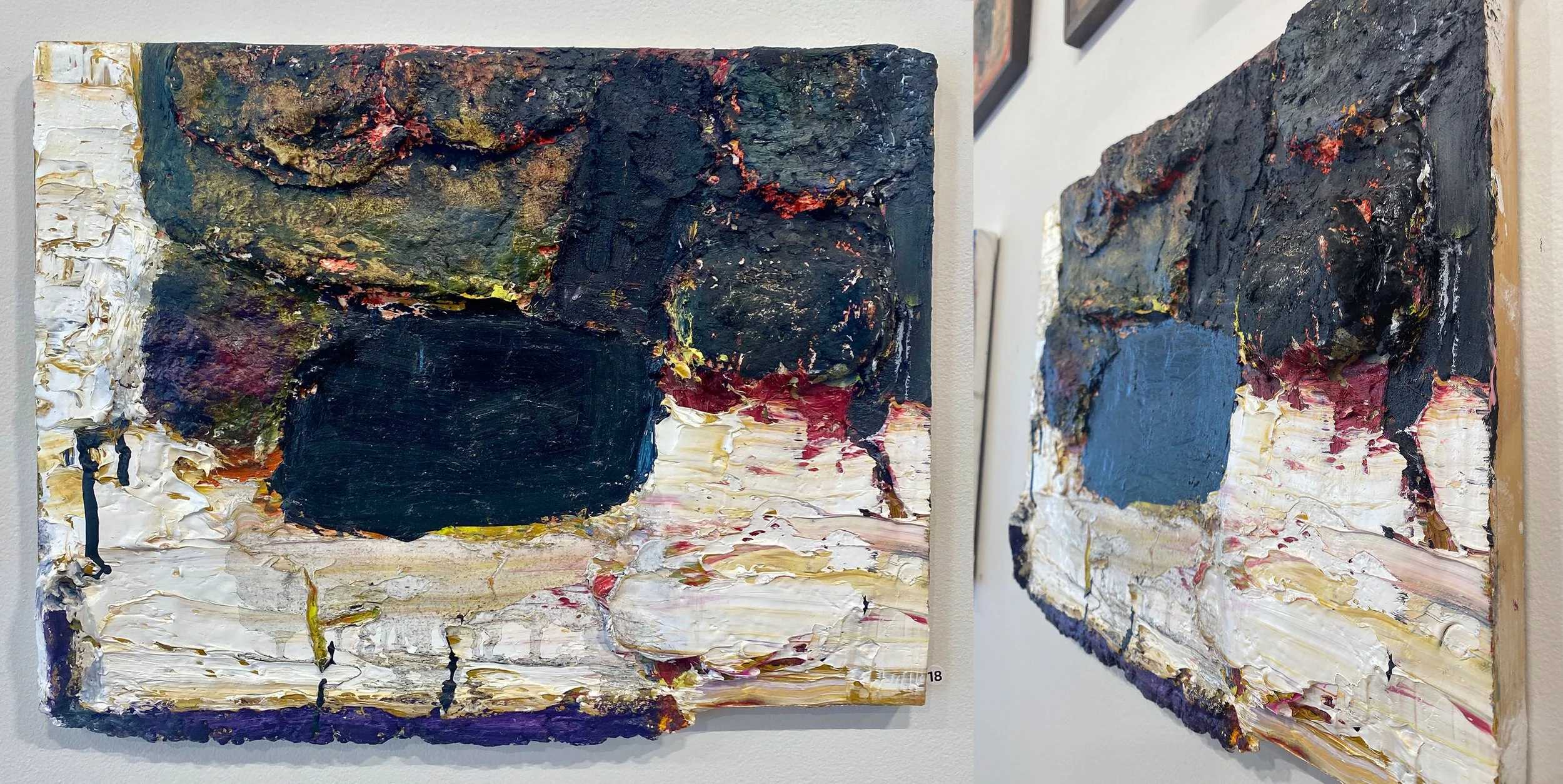 Brenda Goodman, “Covid Time” (2021) oil, mixed media on wood 12 x 16 inches + (side view)