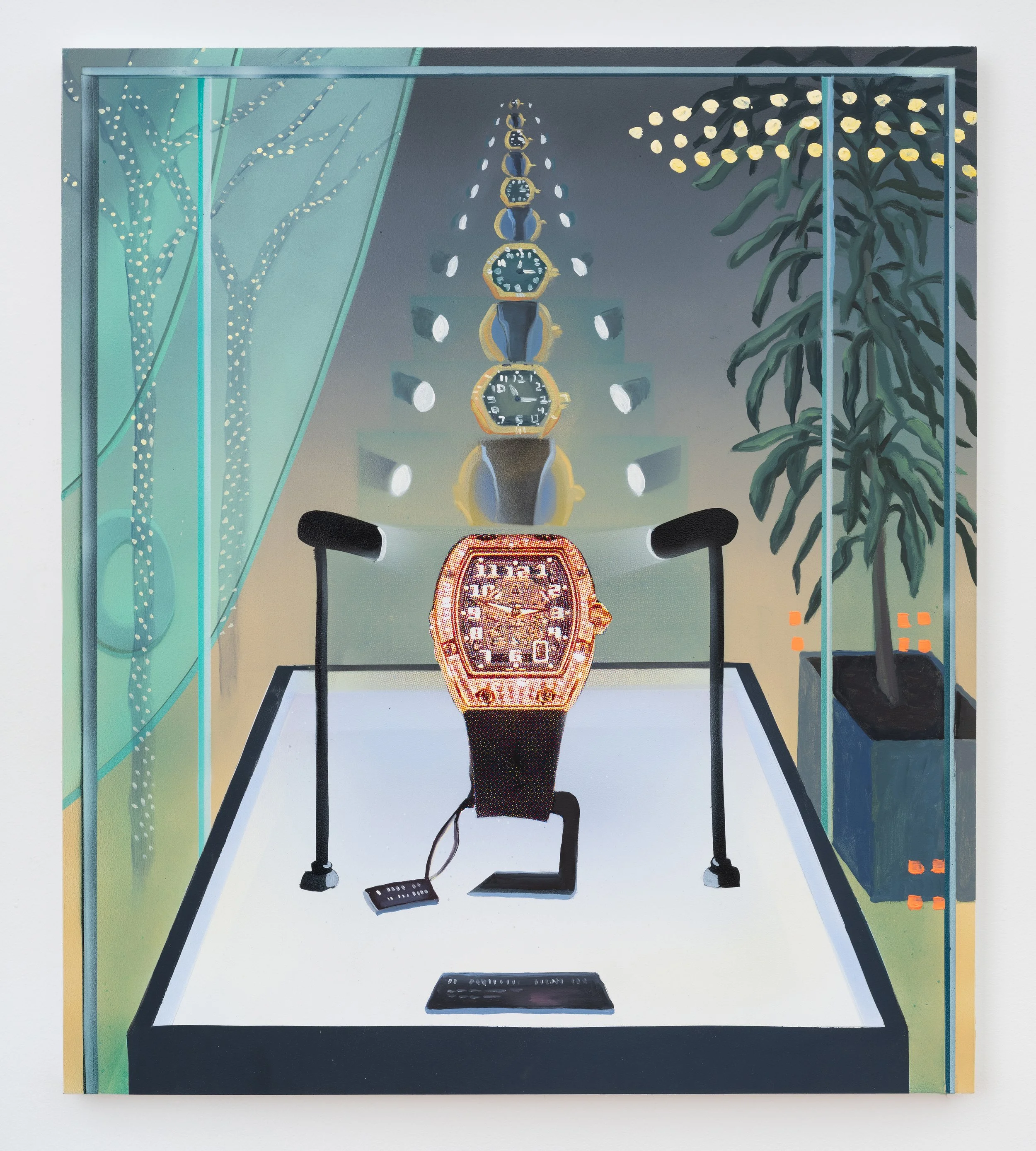 Brown begins each painting through a chance encounter, as if there really is such a thing. Time is synchronous as suggested in Time Display. Stacked bling-bling watches echo into infinity. Mirrored in glass, a mysterious vastness resides in the Baroque hyperreal of the current moment. Returning to the site of initial contact, Brown creates plein air observational studies that are later translated into ambitiously scaled airbrush and impasto paintings composited with print media in the studio. Evocative of glitchy VHS tapes and MTV’s The Real World, Brown’s paintings are the Garbage Pail Kids version of Lisa Frank. Stretching, folding, and compressing time and space, Brown empirically documents what Carl Jung would describe as externalized psychic phenomena, the paranormal material that forms belief.
