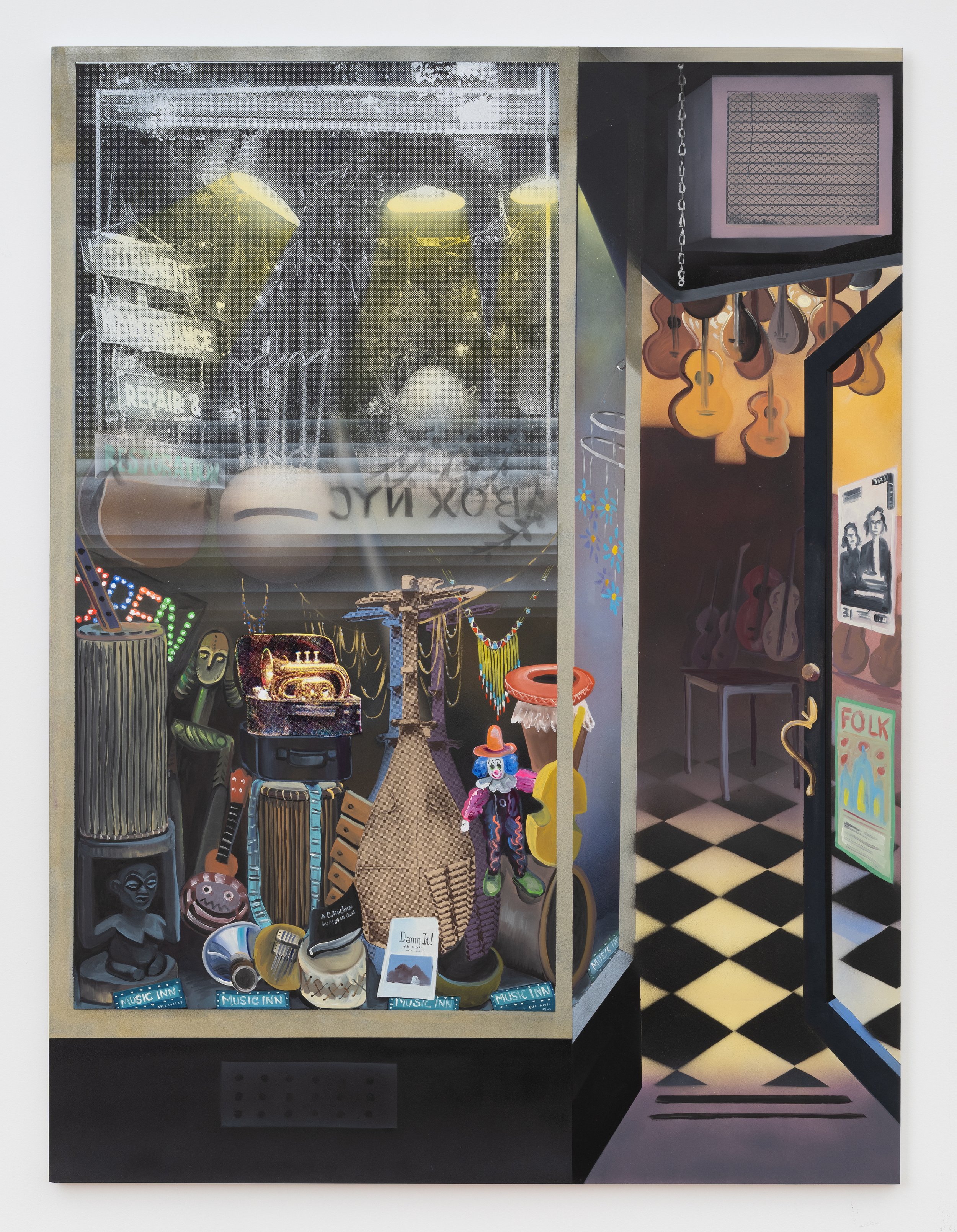 Melissa Brown “Music Inn” (2026) Flashe, oil, acrylic, photo silkscreen on Dibond 59 × 44 inches