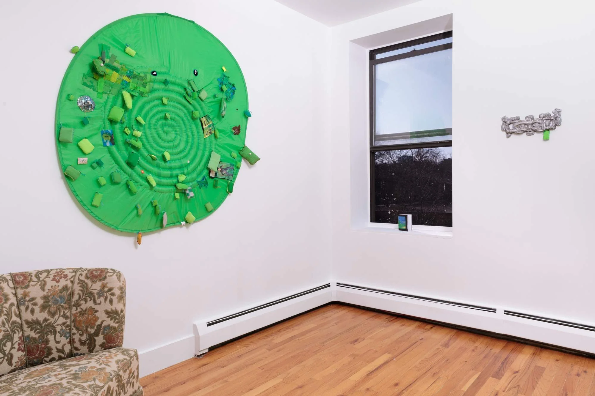 The showstopper is the painterly textile installation KEYEDUPKEYEDOUT, spanning one wall and the main gallery door. So many kinds of green…Mario Kart, Reptaur, key lime…but the effect is of one–undulating, infinitely flat, and fluorescent. Green-screen green. A green that absorbs. Hoover, magnet, tornado. Among the detritus sucked and sewn in: flayed beanie baby, nylon tote bag, sequins, reptile kama sutra. Limbs emerge from within, belonging to someone certainly inside or across the barrier of time and space of this patchwork portal. We learn that the limbs belong to Dead Pixel, Fall’s performance character (alter ego?), that queer trickster spirit. DP was swallowed by the green screen, eaten by the set. Dust to dust. Look again and there is rigor mortis in these stuffed bits. KEYEDUPKEYEDOUT is also a kombucha mother; she has been fed material and separated out over different iterations in different spaces. The stitching builds like scar tissue in one spot, a taste of what her future may hold—a living record of the times she has been taken apart and put back together. The work is punctuated by tiny baubles, fake pearls and cowrie shells and the occasional tinfoil ball, studded into an even diamond net. Fall’s reverence via ornamentation recalls tufted velvet upholstery, or the starry sky in an Indian miniature painting. That decadent and loving impulse to adorn. Then, too, come to mind the corners of bounding boxes on Photoshop.