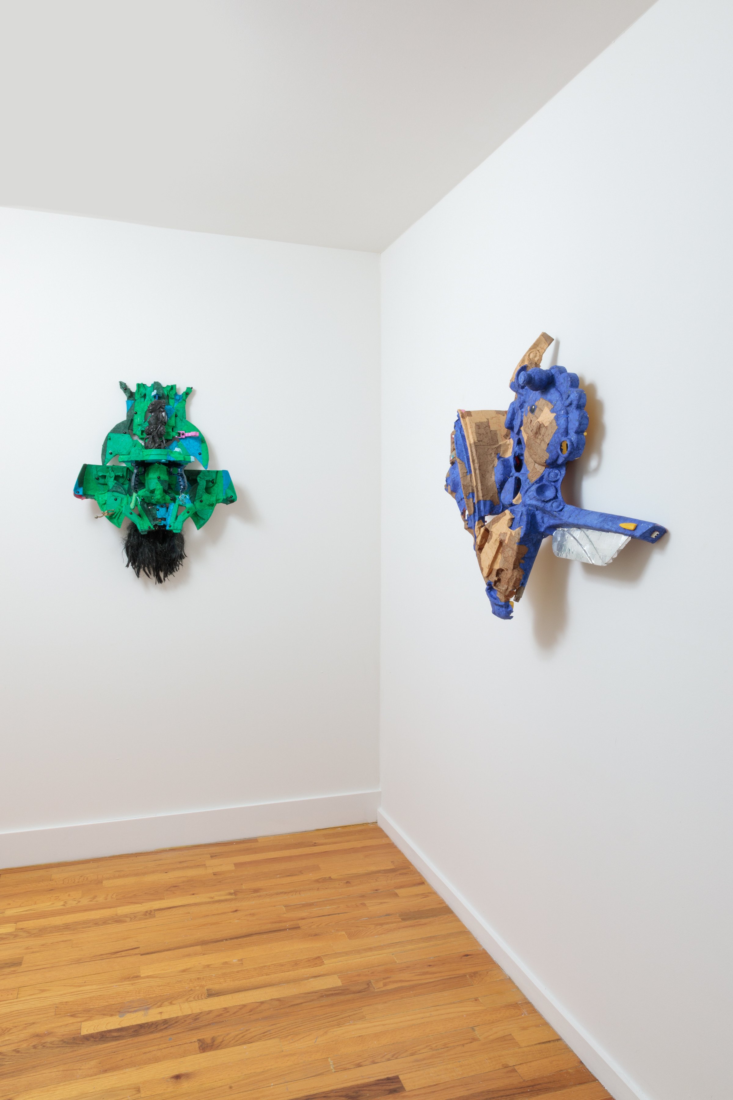 THE PALMTREE, one of two aluminum-cast assemblages, is flocked by a cross made from gridded strips from an Amazon box. Fall transforms material without hiding its origin, taking a horizontal approach: everything is up for grabs, here. The irreverence of using what’s quite literally around is offset by the relentless reverence of the craftsmanship, which feels in the lineage of weaving and other community, narrative art practices. The aluminum itself speaks to jello molds and retro futurist archeology, a cipher to the myth of the peanut moon that you’d have to dust off to find embedded in the ground.